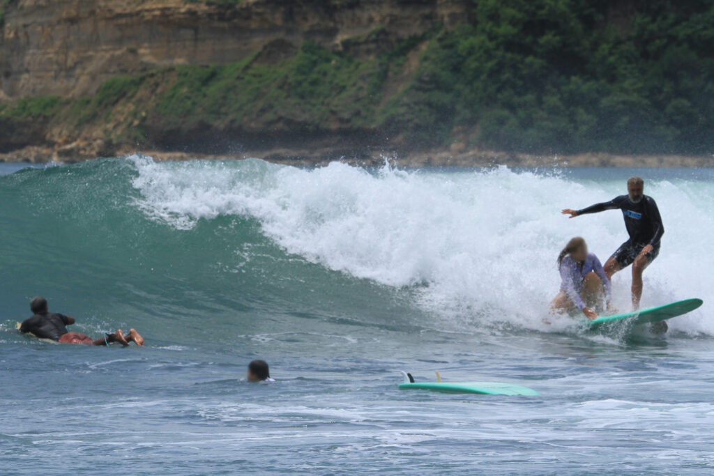 Further down the line is better suited for long-boarders and beginners, so it gets pretty crowded. Many people book surf guides who push them into the waves, and have little regard for priority rules. At the main peak, surfers were more considerate on average. But the peak is a bit shifty, and I found it hard to tell whether people would go left or right. Even when both sides were clear, I sometimes struggled to decide which way to go myself.